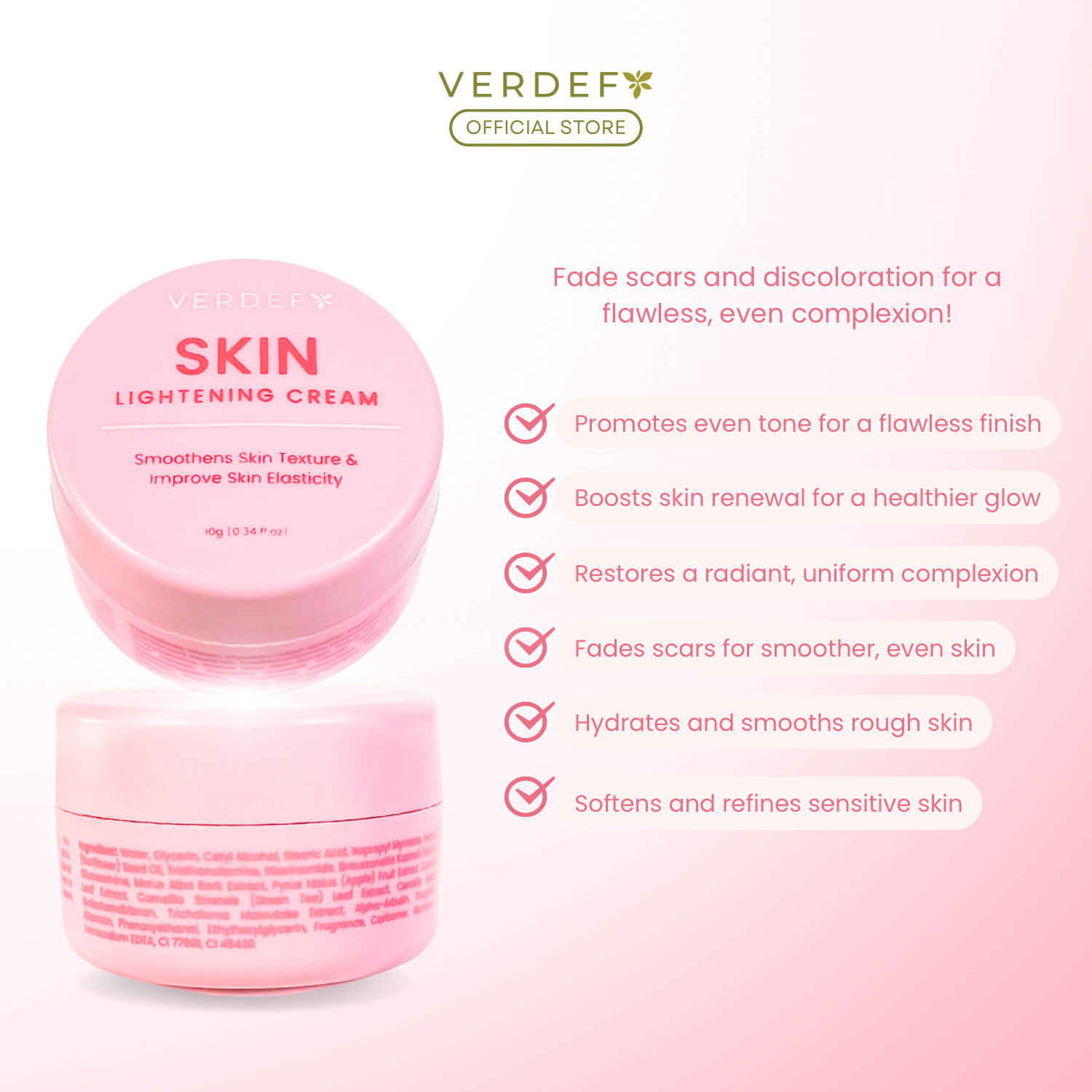 Say goodbye to dark patches, scars, and stretch marks with the powerful formula of VERDEFY SKIN LIGHTENING CREAM!
